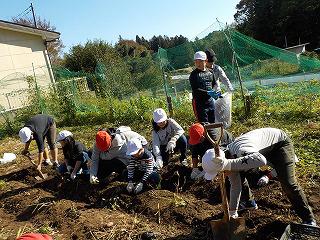 昼休みに、農園のサツマイモを全校生で掘りました。高学年がスコップを準備したり、下級生が掘るのを手伝ったりしてくれました。大きなイモが多く、一つ掘るのに時間がかかりました。掘り終わってから、なかよし班ごとに分けて、家に持ち帰りました。