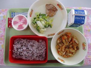 今年の初午は2月9日でしたが、日曜日でしたので、今日の給食が「はつうまこんだて」でした。献立は、「牛乳・くろまいごはん・とりにくのこうみやき・そくせきづけ・しもつかれ・とちおとめアイス」でした。アイスもあり豪華でした。