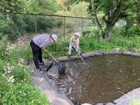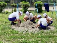 男子児童は、校庭の奥にある池をさらい、オタマジャクシやヤゴを見つけていました。この池には、生き物がたくさんいます。またある日は、砂山を掘ってトンネルを作っていました。