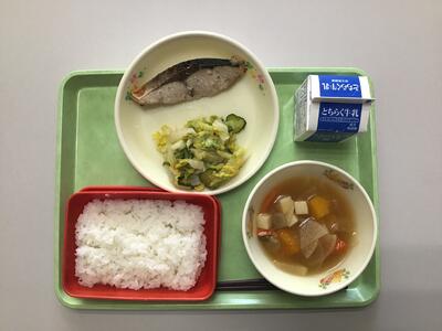 メニューは、ごはん、ブリの塩麴焼き、ゆず入り白菜サラダ、かぼちゃ入りけんちん汁、牛乳です。
