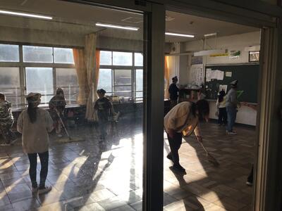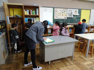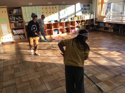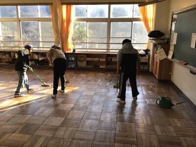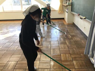 そして、ごみをとり、水拭きです。こちらも、班ごとに分担して仕事にあたっています。