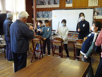 今日は、5・6年生が地域の方々にお囃子を教わりました。