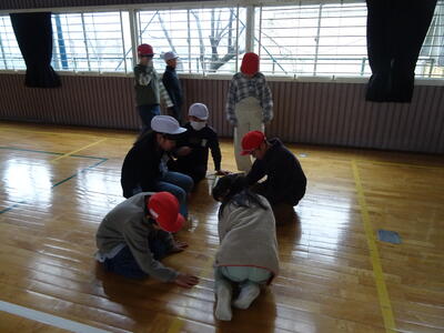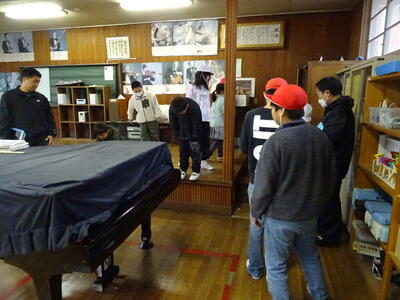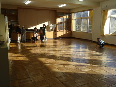 こちらは、体育館です。入口の階段の様子や床のささくれがないか等、みんなで慎重によく見ていました。