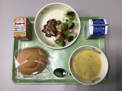 減量バターロールパン、ハンバーグデミグラスソースがけ、花野菜サラダ、コーンスープ、セレクトケーキ、牛乳です。