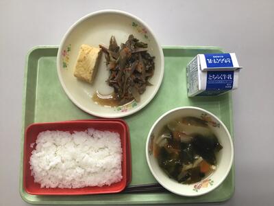 ごはん、太巻き卵、しぐれ煮、満点みそ汁、牛乳です。