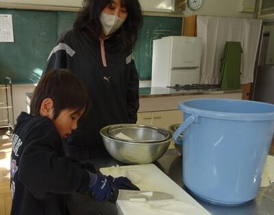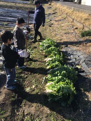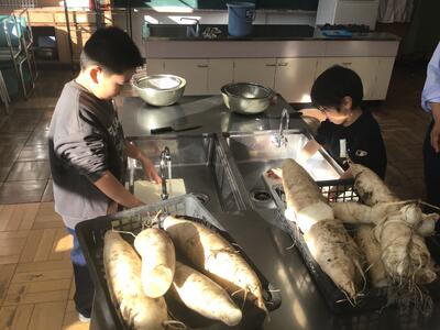 子どもたちが調べた動画では、新鮮な「買ってきた」大根を使うと言っていましたが、今回は、とびきり新鮮な「掘ってくる」大根を使いました。