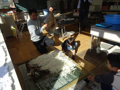そして、網の上に干します。途中、網がひっくり返ってしまうハプニングがありましたが、それも乗り越え、協力して頑張りました。