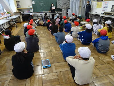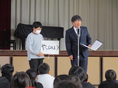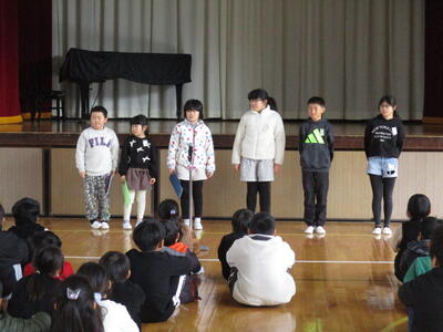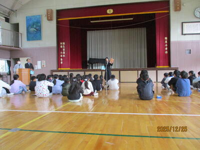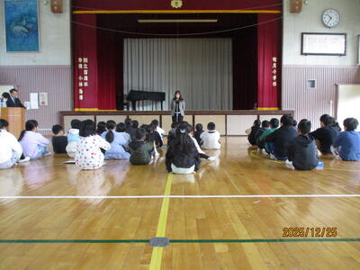 次は、校長の話です。いつも話している「やってみよう」「正しいことを続ける」「意見交かん」などについてふりかえったり、冬休みに頑張ってほしいことについて話したりしました。