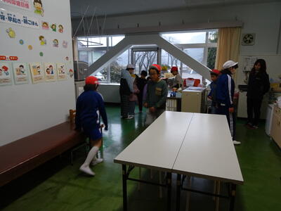 まずは、みんなで荷物の移動。低学年生が持てないものは、高学年生が手助けしたり、置く場所をアドバイスしたりして、通路を確保しています。