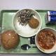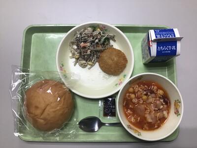 丸パン(スライス)、えびカツ、チキンごぼうサラダ、ミネストローネ、牛乳です。