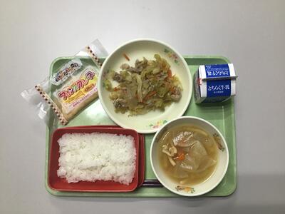 ごはん、豚肉の生姜焼き、大根の味噌汁、カスタードクレープ、牛乳です。