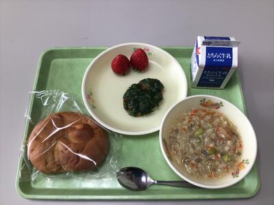 さつきの舞米粉パン、ハンバーグにらソースかけ、はと麦雑炊、いちご(2)、牛乳です。