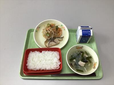 内容は、ごはん、サバのネギ塩焼き、ゴイ・スア(くらげのサラダ)、ミエン・ガー(鶏肉と春雨のスープ)、牛乳です。