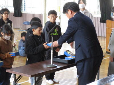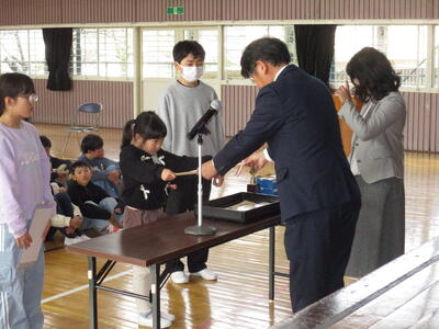 校内持久走大会の1位の児童には、名前入りのメダルを授与しました。