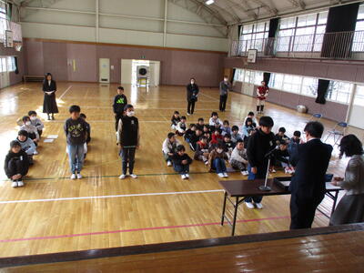 次は、校長の話です。いつも話している「やってみよう」「正しいことを続ける」「意見交かん」などについてふりかえったり、冬休みに頑張ってほしいことについて話したりしました。