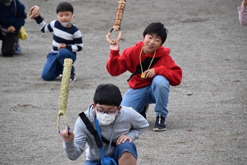 10月8日(土)は十三夜でした。今年も大越路の子どもたちが、学校にわらでっぽうを打ちにきてくれました。
