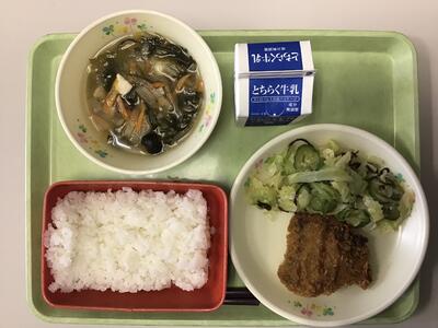 メニュー:ごはん ぎゅうにゅう かつおフライ しおこんぶあえ さわにわん