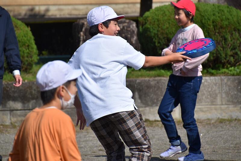 今日の業間は全校共遊でした。みんなでフリスビードッジで遊びました。