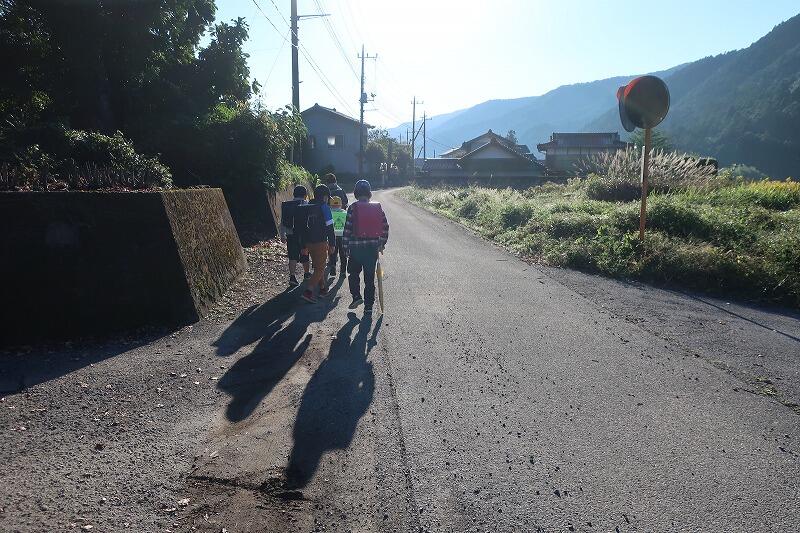 朝つゆが光る美しいけしきの中を学校へと向かいます。
