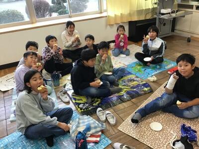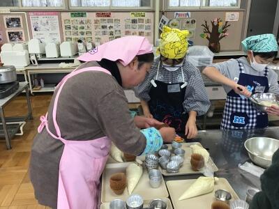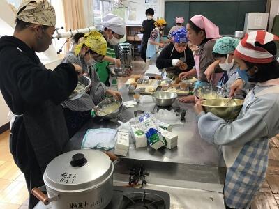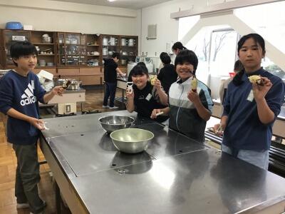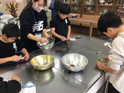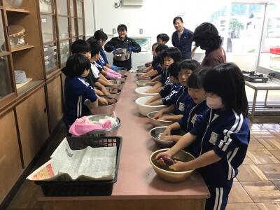 今日は先日掘ったさつまいもを使ってさつまいも蒸しパンを作って全校児童で食べました。食生活改善推進委員の2人をゲストティーチャーにお招きして、一緒に調理していただきました。それぞれ役割分担をしました。1.2年生はさつまいもを洗いました。3.4年生はさつまいもを剝きました。5.6年生が蒸しパンを作りました。