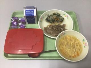 せきはん モロのたつたあげ にらいりおひたし かんぴょうのたまごじる けんみんのひデザート
