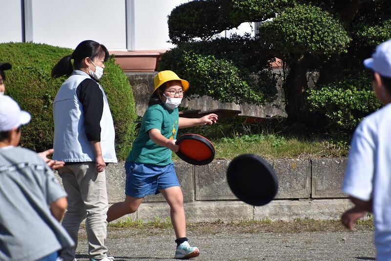 今日の業間は全校共遊でした。みんなでフリスビードッジで遊びました。