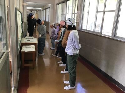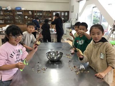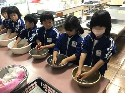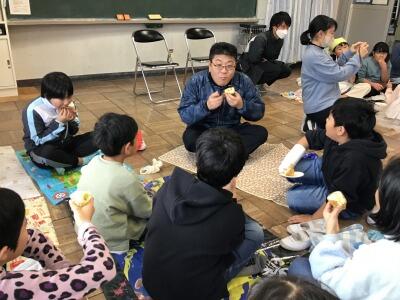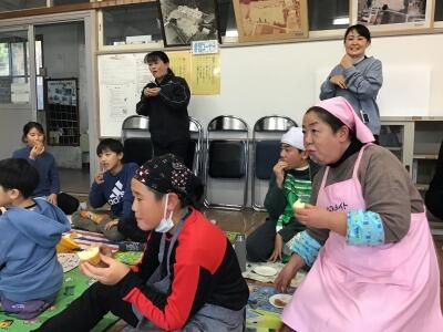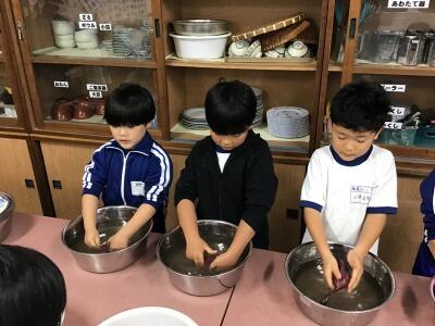 今日は先日掘ったさつまいもを使ってさつまいも蒸しパンを作って全校児童で食べました。食生活改善推進委員の2人をゲストティーチャーにお招きして、一緒に調理していただきました。それぞれ役割分担をしました。1.2年生はさつまいもを洗いました。3.4年生はさつまいもを剝きました。5.6年生が蒸しパンを作りました。