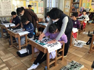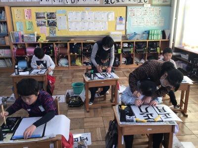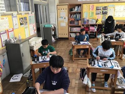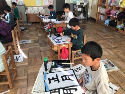 今日は書道ボランティアの先生をゲストティーチャーにお招きして書道の授業を行いました。3校時に3.4年生、4校時に5.6年生で実施しました。筆の使い方どなどをよく教えていただき、みるみるうちに上達しました。これからも定期的にお世話になります。どうぞよろしくお願いいたします。