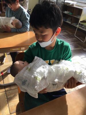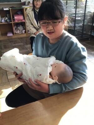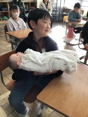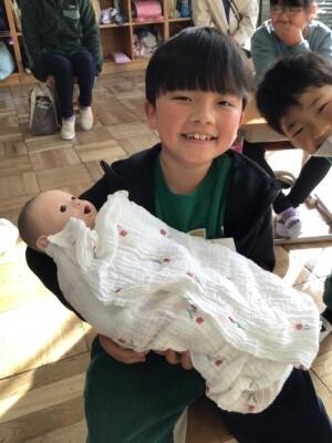 授業の最後に、生まれたばかりの赤ちゃんの重さと同じ重さの人形を抱っこしました。