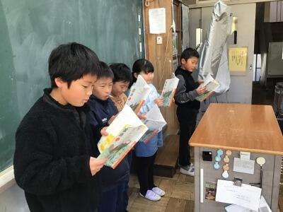 今日は、3年生から、ぜひみんなに読み聞かせをしたいという提案があり、4.5年生と6年生に読み聞かせをしてくれました。練習もしっかり行い、役になり切って読み聞かせを行いました。