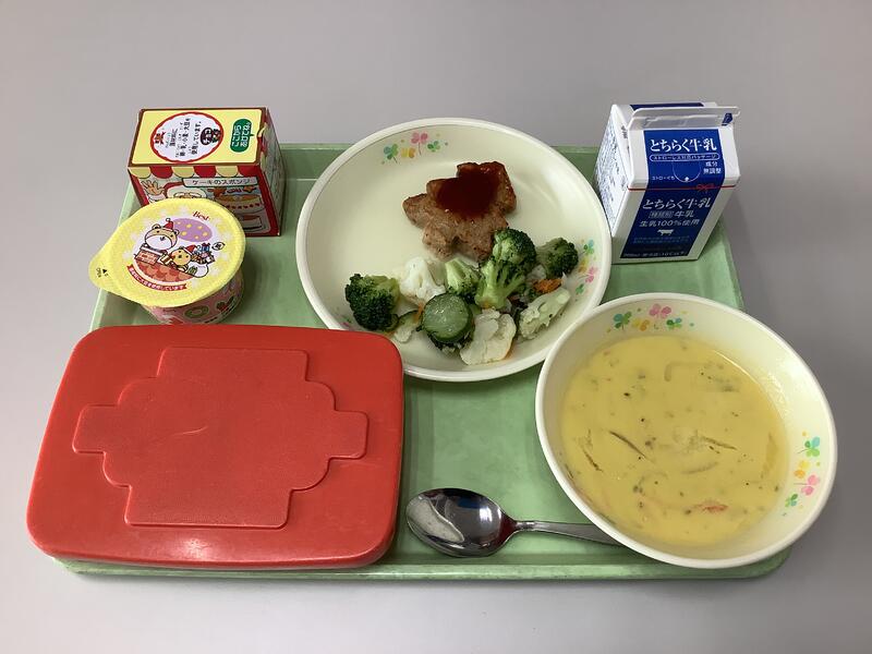 ごはん ハンバーグケチャップソースかけ はなやさいサラダ コーンスープ デザートどちらかひとつ