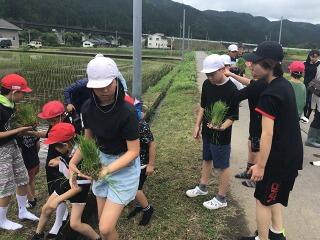 昨年度までは、5年生の社会科の「米作りの盛んな地域」という単元と総合的な学習の地域学習の一環として、隔年で実施してましたが、今年度は、地域ボランティアの方との連携・協働で、「地域とともにある学校」づくりの一環としての勤労・生産的行事として全校児童で田植えを実施しました。子どもたちはなかなか田んぼの中で歩くことが難しかったようで、苗を植えるのが難しかったようですが、楽しんで田植え体験ができました。