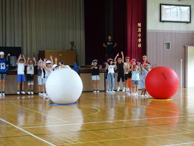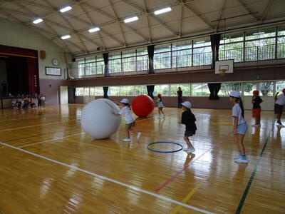 今日は、朝のうちまでの雨で校庭が使えませんでした。そのため、「大玉転がし」の練習は体育館で行いました。
