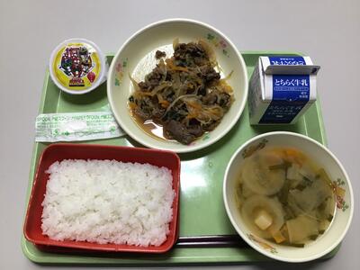 ごはん、鹿沼和牛のプルコギ、干瓢とにらのみそ汁、カヌマンゼリー、牛乳です。