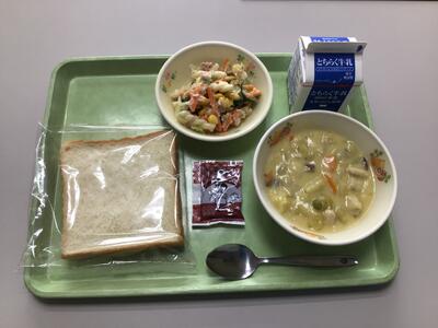食パン、チョコクリーム、サツマイモのシチュー、ツナコーンサラダ、牛乳です。