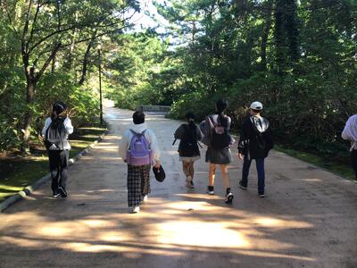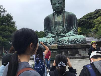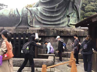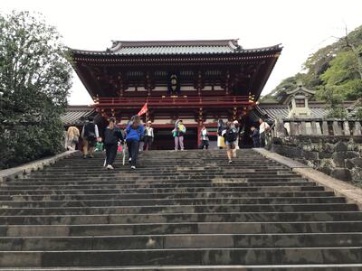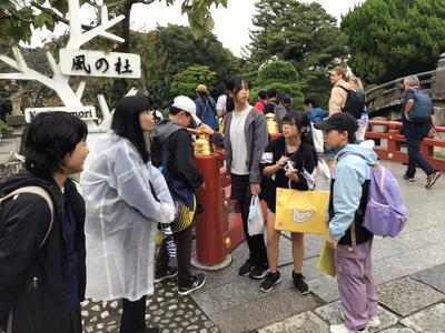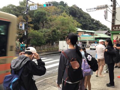 鎌倉の班別行動がひと段落して、鶴岡八幡宮の太鼓橋前に全員無事に集合しました。表情には少し疲れが見えるものの、みんな元気です。