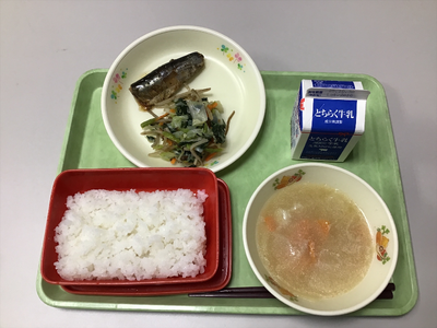 ごはん、いわしのおかか煮、小松菜とゴボウの和え物、ゴマ汁、牛乳です。