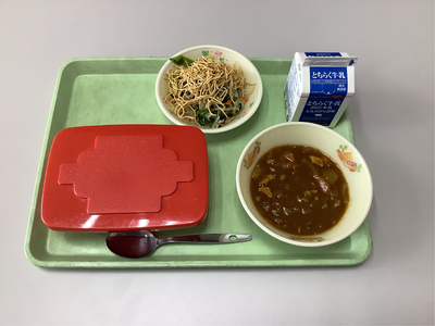 大麦ご飯、チキンカレー、パリパリサラダ、牛乳です。