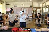 10日(水)の放課後、教職員で「心肺蘇生法・AEDの使用方法」についての研修を行いました。今年度、学校では、感染症拡大防止のため、プールを使った水泳学習は残念ながら行いません。しかし、水の事故がますます心配されるこの時期に研修を実施することで、いざという時に備えています。