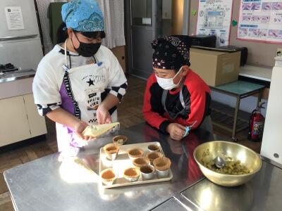 今日は先日掘ったさつまいもを使ってさつまいも蒸しパンを作って全校児童で食べました。食生活改善推進委員の2人をゲストティーチャーにお招きして、一緒に調理していただきました。それぞれ役割分担をしました。1.2年生はさつまいもを洗いました。3.4年生はさつまいもを剝きました。5.6年生が蒸しパンを作りました。