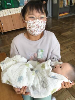 授業の最後に、生まれたばかりの赤ちゃんの重さと同じ重さの人形を抱っこしました。