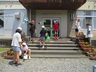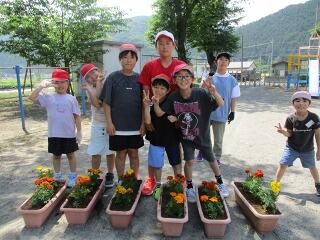 今日の業間の時間に緑化活動としてマリーゴールドをプランターに植えました。縦割り班になり、上級生が下級生に教えてあげながら植えました!玄関前に置きました!