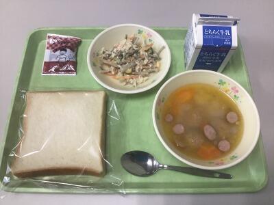 しょくパン チョコクリーム にくだんごとやさいのコンソメに チキンごぼうサラダ