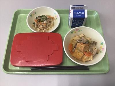 ごはん かつおカツ とりにくとたけのこのいために だいこんのみそしる