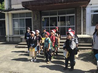 あいにくの雨ですが、5年生のみんなは元気に粕尾小を出発しました。
