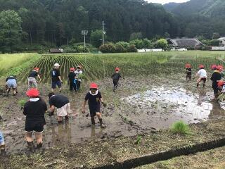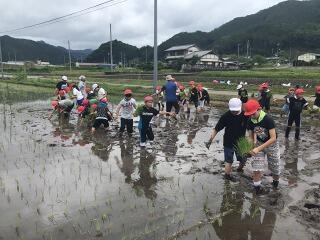 昨年度までは、5年生の社会科の「米作りの盛んな地域」という単元と総合的な学習の地域学習の一環として、隔年で実施してましたが、今年度は、地域ボランティアの方との連携・協働で、「地域とともにある学校」づくりの一環としての勤労・生産的行事として全校児童で田植えを実施しました。子どもたちはなかなか田んぼの中で歩くことが難しかったようで、苗を植えるのが難しかったようですが、楽しんで田植え体験ができました。