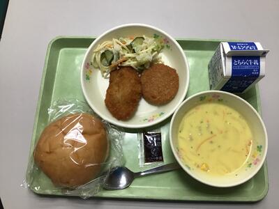 メニューは、まるパン、ハムカツまたは白身魚フライ、スパゲティサラダ、コーンスープ、牛乳です。