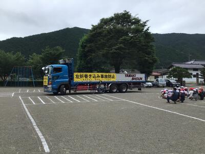 その中でも今日は、大型トラックの内輪差の危険、トラックの運転席には死角があること、横断歩道を渡るときは右後ろも見て、手を挙げてアピールすることを中心に学習しました。