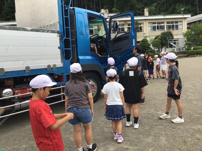 全校児童が、トラックの運転席や助手席に座らせてもらいました。