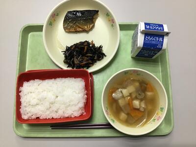 ごはん、サバの塩焼き、磯煮、鳥ゴボウ汁、牛乳です。